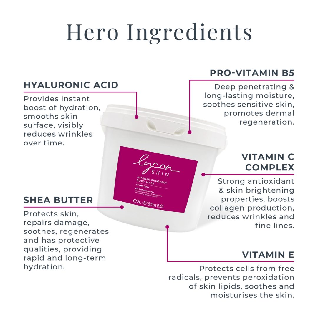 A luxurious and fresh crème-gel mask with Pro-vitamins B5, C & E, Hyaluronic Acid, Shea Butter and Pomegranate extract. This action packed mask provides an instant moisture surge for quick hydrating relief for dry and tired skin. It also contains nourishing botanicals and a multivitamin complex for long term hydration and barrier support. Intense Recovery Body Mask easily rinses or wipes off, leaving no greasy or powdery residue, just silky smooth hydrated and youthful looking skin.