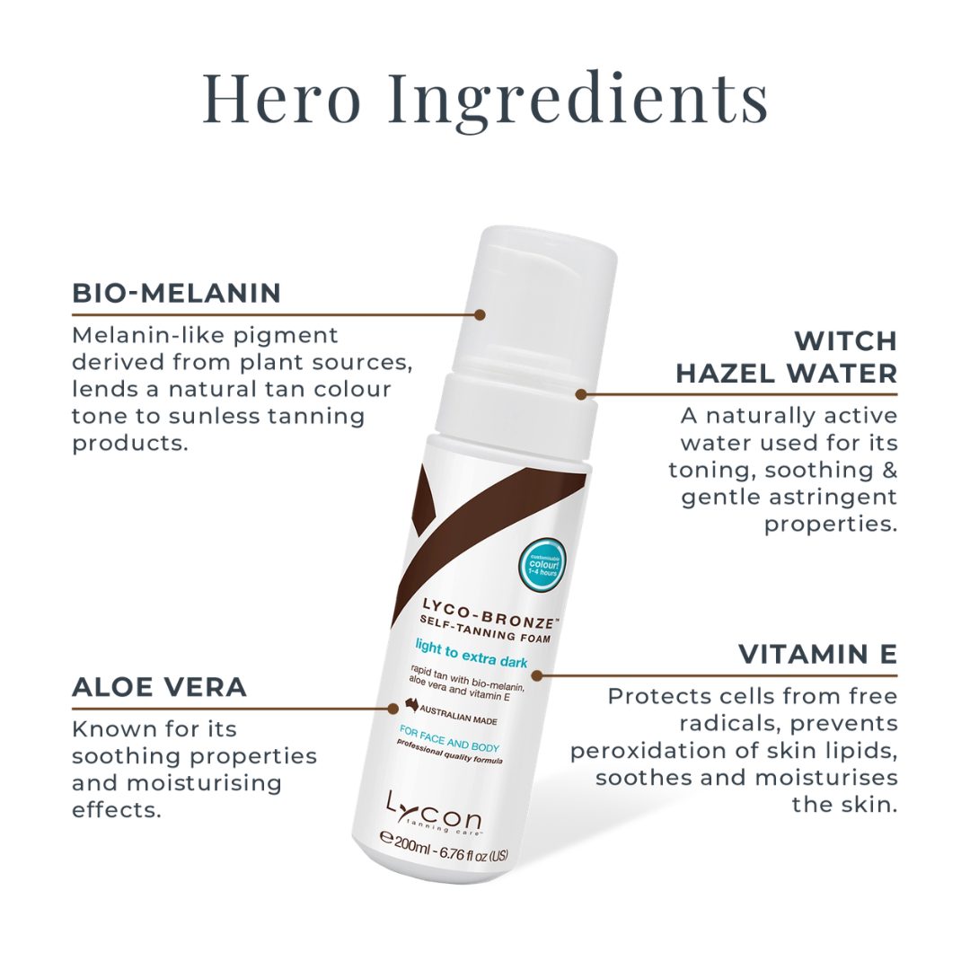 This cutting edge formula with additional hydrating and skin-loving botanicals nourishes as you tan. LYCO-BRONZE Self-Tanning Foam delivers an iconic, natural Australian glow all year round!