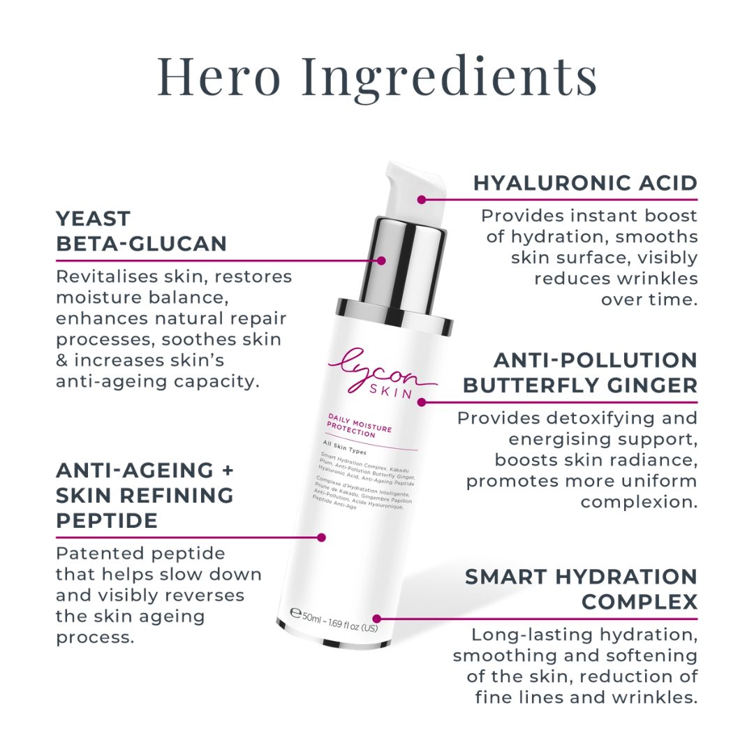 An advanced day cream that instantly hydrates, soothes, nourishes and protects the skin with the antioxidant power of Kakadu Plum, Vitamins C and E, plus Co-enzyme Q10 to fight free radical damage. It contains the LYCON Skin signature anti-ageing powerhouse blend of Yeast Beta-Glucan, wrinkle reducing Peptide and dual weight extra hydrating Hyaluronic Acid, which work together to unlock multiple anti-ageing pathways, visibly reducing the signs of ageing. With regular use, skin will appear firmer, brighter, less lined and less wrinkled.