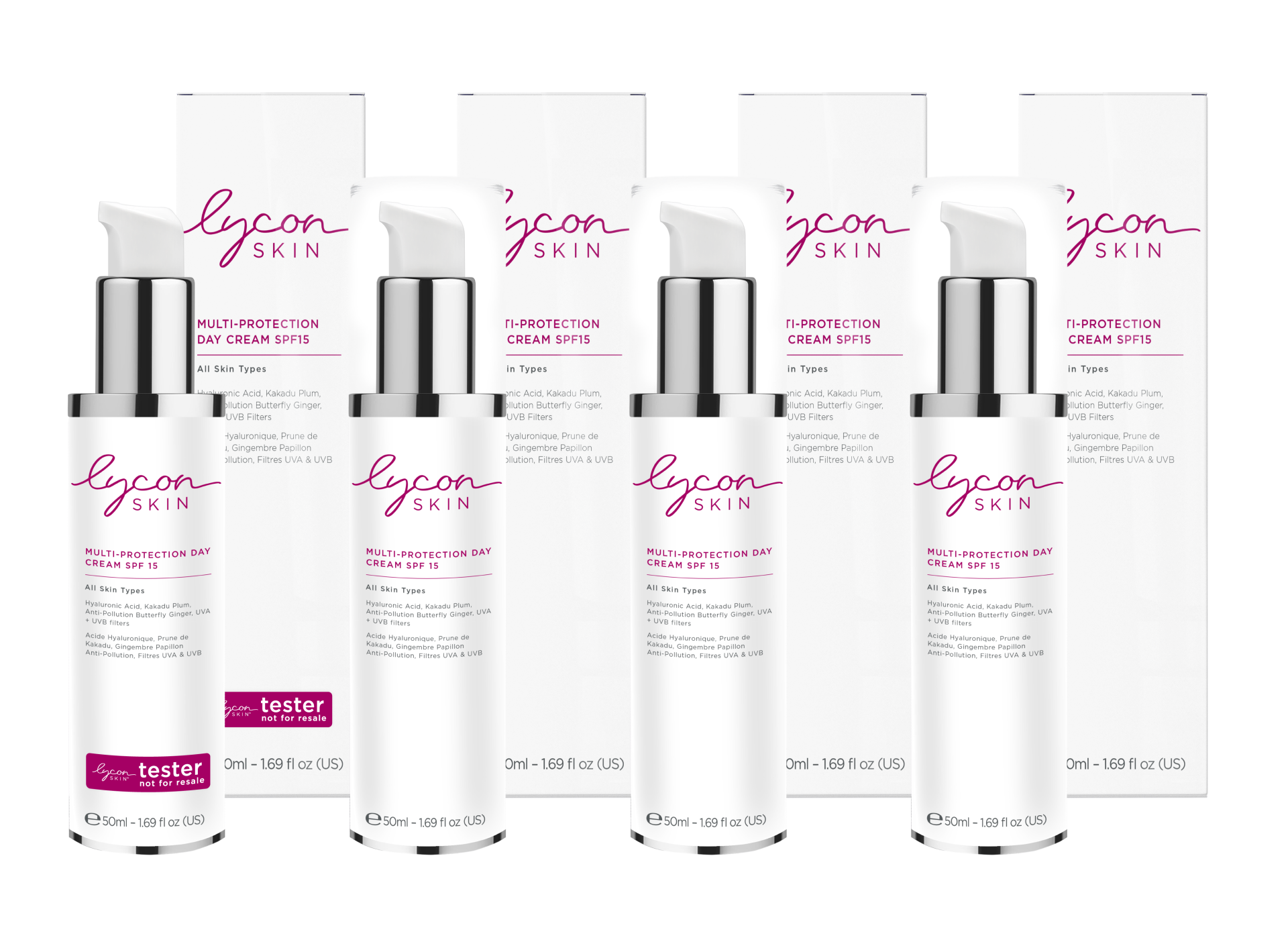 A precisely balanced multi-protective day cream with the anti-ageing powerhouse blend of LYCON Skin’s signature Yeast Beta-Glucan, wrinkle reducing Peptide, dual weight Hyaluronic Acid, and fast acting antioxidants and botanical extracts that counteract free radicals, pollution, and blue light exposure. Multi-Protection Day Cream SPF15 rapidly hydrates, firms, lifts and plumps, whilst it protects against harmful UVA and UVB rays, boosting the skin’s natural renewal processes and support system. With regular use, it reduces the appearance of lines and wrinkles and fortifies the skin against premature ageing.
