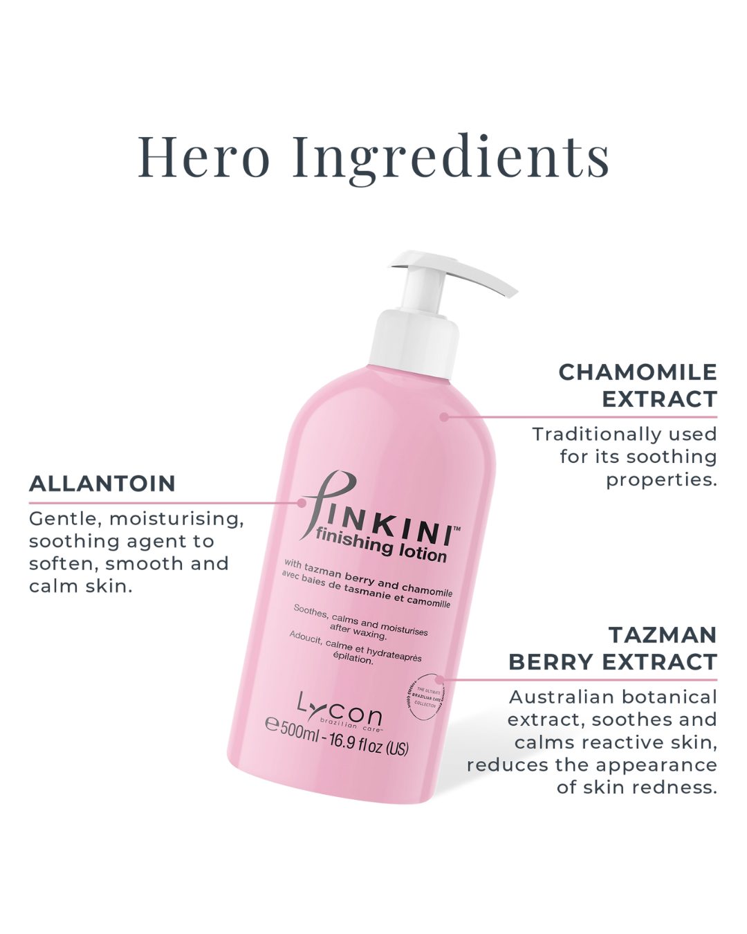 A light and refreshing lotion, formulated with soothing Chamomile, Allantoin and Tazman Berry. PINKINI Finishing Lotion is pleasantly scented, while it calms, moisturises and protects the skin after waxing.