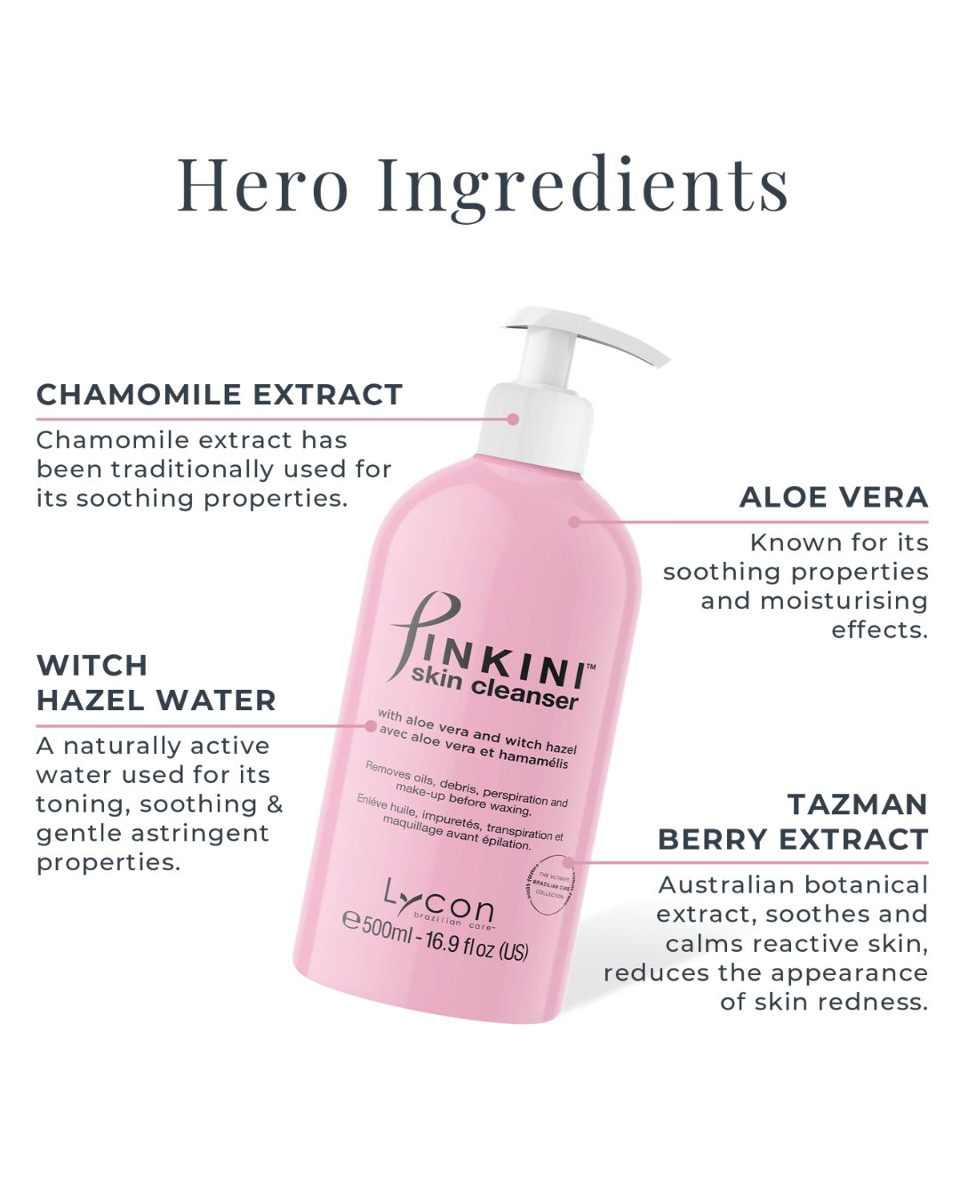 Gentle PINKINI Skin Cleanser with the soothing botanical blend of Tazman Berry, Bisabolol, Aloe Vera and Chamomile, is non-drying and does not sting or burn.