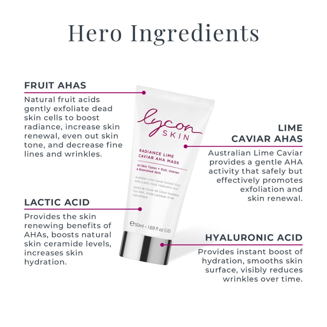 With exotic Australian Lime Caviar extract, AHA Fruit Acids and extra plumping Hyaluronic Acid, this multi action treatment mask can be used all over the face to rapidly lift layers of dull lifeless skin cells to reveal a fresher, smoother, more evenly toned and radiant looking complexion, after just one use.