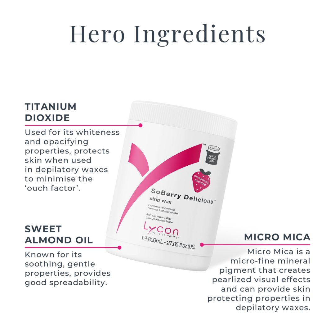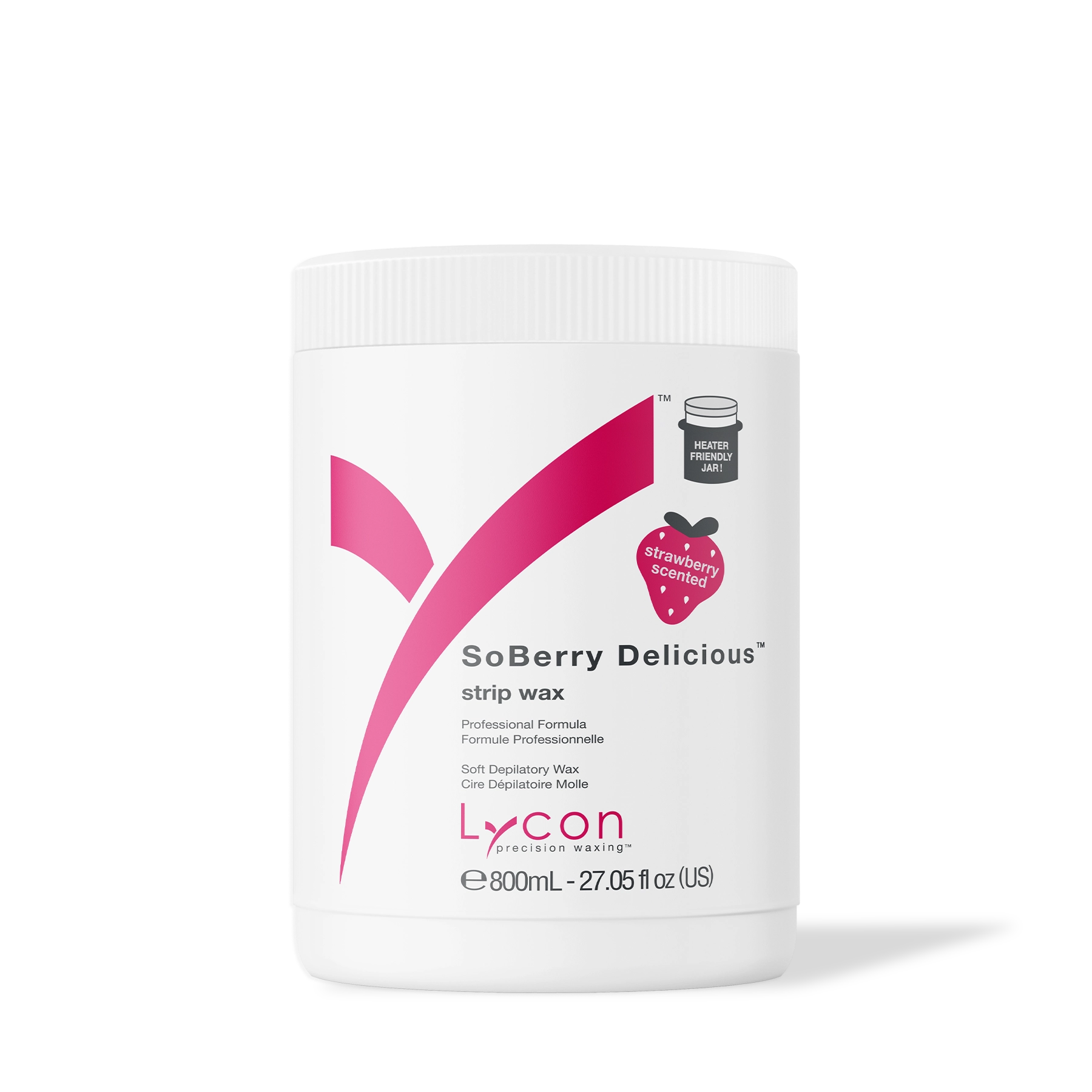 With its delicious strawberry scent and spectacular, sparkling Micro Mica, SoBerry Delicious strip wax removes hair quickly and gently, with no skin drag.